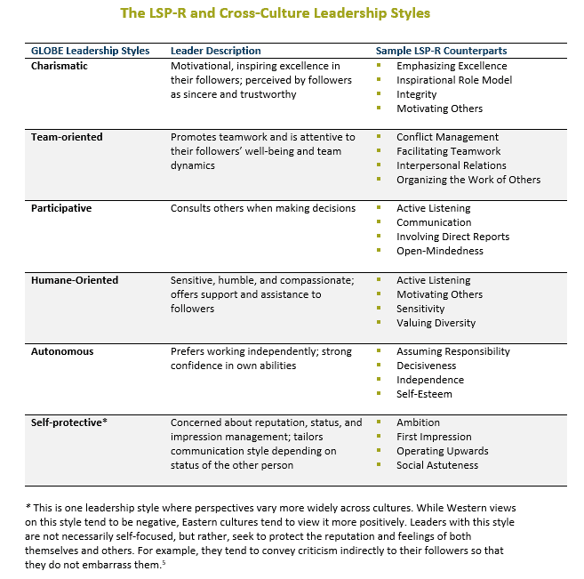 Take for example, the GLOBE project.[5] Researchers gathered a large cross-cultural sample of leaders. They then examined six different leadership types that have been demonstrated around the world, and evaluated the popularity of these approaches across clusters of countries. Charismatic and team-oriented leadership were positively valued by most country clusters, and self-protective leadership was perceived negatively by most country clusters. Each of the six leadership types observed as part of the GLOBE project are largely covered by LSP-R competencies. These styles and their LSP-R counterparts are summarized in the table below.