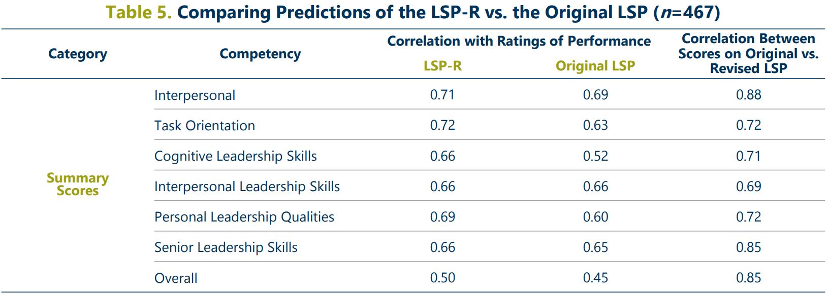 - Construct Validation – LSP-R competencies have been found to predict relevant workplace behaviors