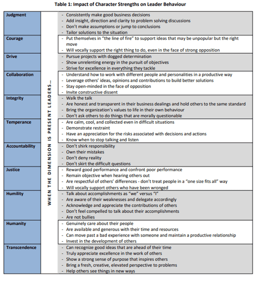 The following table displays the impact of each of the 11 leader character strengths on leader behavior. In the leader character model, all of the dimensions matter, interact with one another, and cumulatively predict personal well-being, excellence, and organizational performance. Judgment is central to the model, and it draws on each of the other 10 dimensions to make consistently effective decisions.