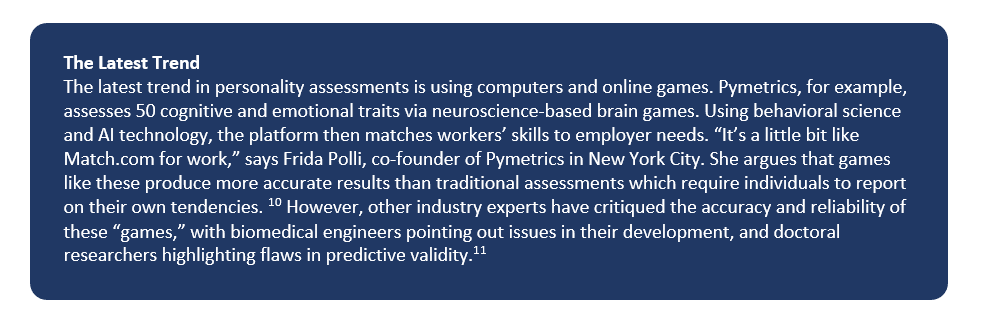 A recent trend in personality assessment has been the use of computers and online games. Pymetrics, for example, assesses 50 cognitive and emotional traits via neuroscience-based brain games. Using behavioural science and AI technology, the platform then matches workers’ skills to employer needs. “It’s a little bit like Match.com for work,” says Frida Polli, co-founder of Pymetrics in New York City. She argues that games like these produce more accurate results than traditional assessments which require individuals to report on their own tendencies. However, other industry experts have critiqued the accuracy and reliability of these “games”, with biomedical engineers pointing out issues in their development, and doctoral researchers highlighting flaws in predictive validity.1