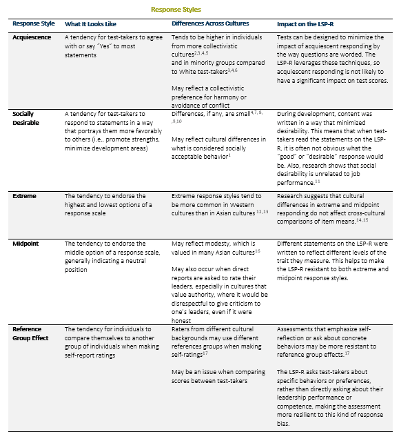 Many organizations consider leadership assessment to be a valuable component of their talent management systems for several reasons. These assessments can highlight individual strengths, identify potential areas for development, help inform selection decisions, or even support succession planning initiatives. Because leadership assessments can be leveraged in so many ways and their use can have a significant impact on personnel decisions, it is important that these assessments are used fairly and consistently across all leaders in an organization. This is especially important to consider in contexts where test-takers’ response styles may differ.