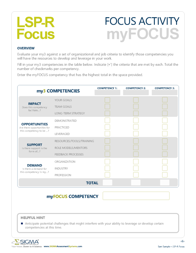 The second activity in the LSP-R Focus Report is on page 6. This activity is intended to help you set development goals and narrow your my3 competencies down to a single myFOCUS competency. This will be the first competency for which you create a leadership development plan.
