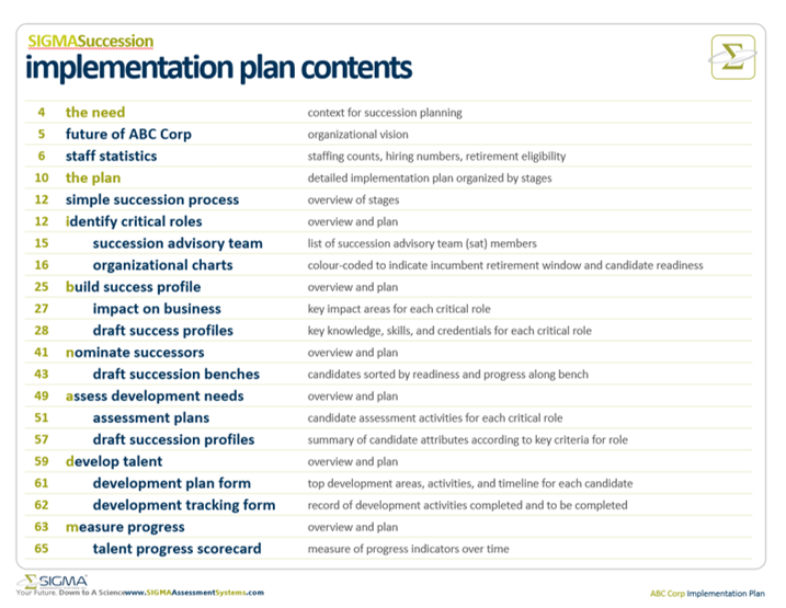 Contents of an implementation plan for succession planning by SIGMA Assessment Systems