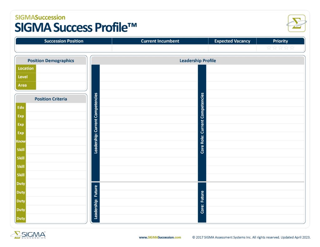 The SIGMA Success Profile template is an analytical worksheet designed to describe the talent needed for success in a critical role. The goal of the worksheet is to outline the knowledge, skills, abilities, and competencies needed for the role, both now and in the future. A SIGMA Success Profile provides leaders with a clear, comprehensive list of the requirements for a critical role. As a result, each SIGMA Success Profile sets the standard for training and development, while also acting as a benchmark against which to assess and evaluate succession candidates. In this way, a SIGMA Success Profile for all key roles can be used to create a more simplified and standardized process for talent assessment, development, and selection.