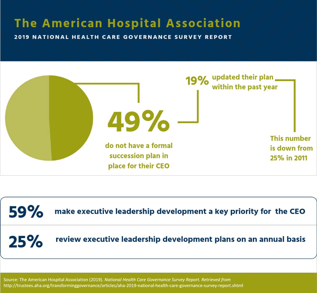 The American Hospital Association (AHA) recently released their 2019 National Health Care Governance Survey Report. Although the report suggests that some succession planning in hospitals is occurring for the role of CEO, there is certainly a sense that there is more work to be done.
