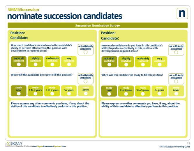 The Succession Nomination Survey is a simple succession planning tool that can be used to identify which candidates to consider for the critical roles you identified in phase one.