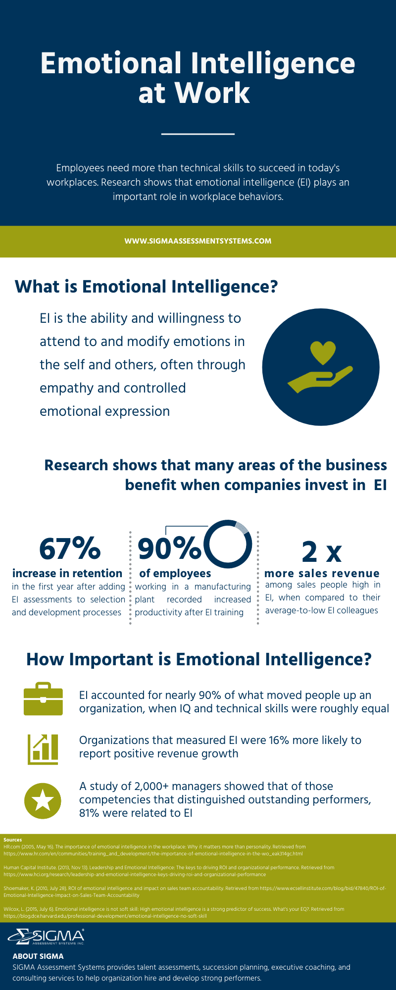If you’re ready to start building a more emotionally intelligent workplace, SIGMA has the tools you need to get started. The Multidimensional Emotional Intelligence Assessment-Workplace-Revised (MEIA-W-R) is a reliable, valid measure of emotional intelligence specifically designed to capture EI at work. The MEIA-W-R’s easy, online administration and user-friendly report generation is ideally suited to help identify the facets of EI that individuals are inclined towards and which facets require further growth. Check out our website, or contact us if you’d like more information. We’re always happy to chat!
